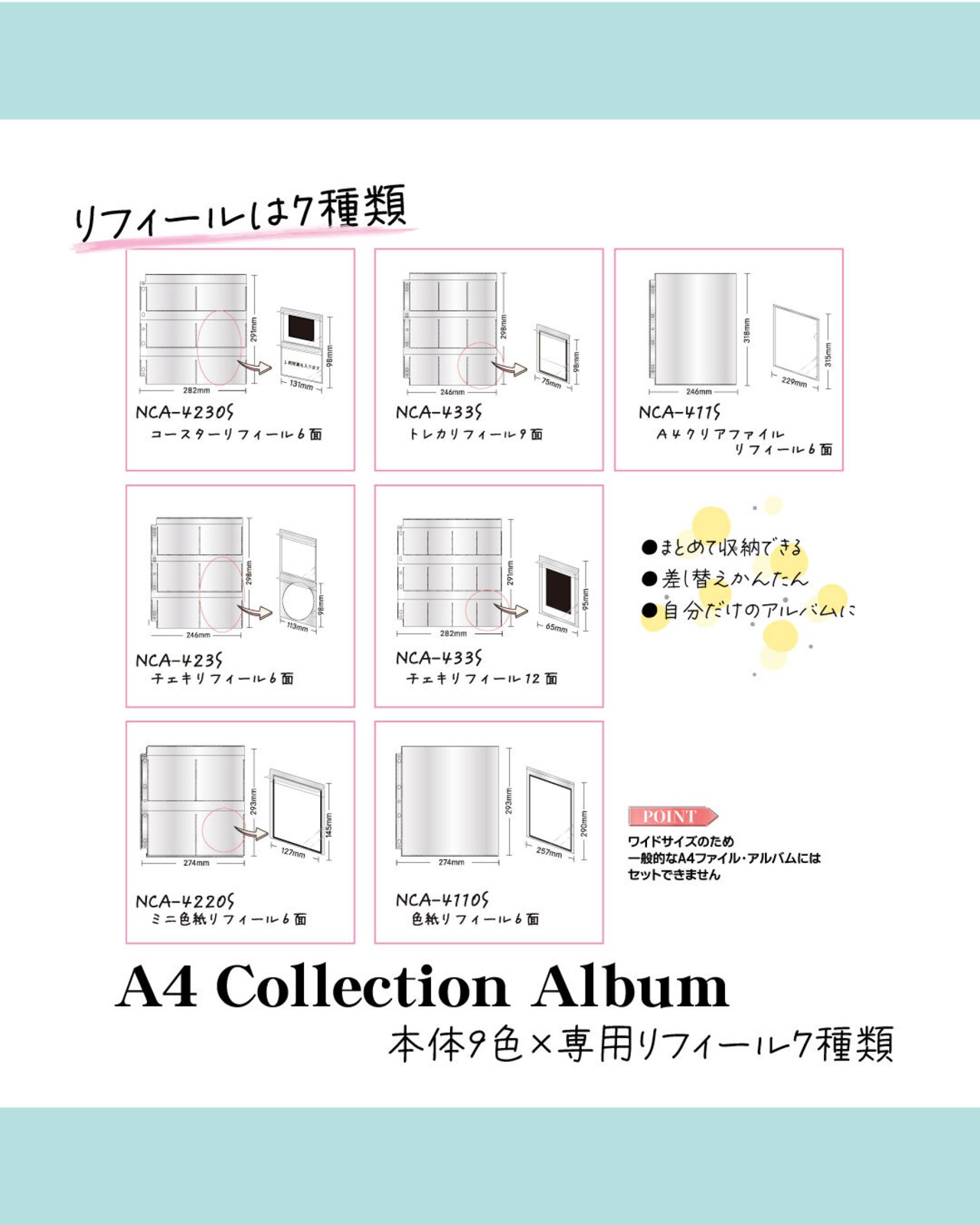 ●9色のコレクションアルバムA4サイズと、7種類の専用リフィール(別売)と組み合わせて、自分だけのコレクションアルバムを作ることができます