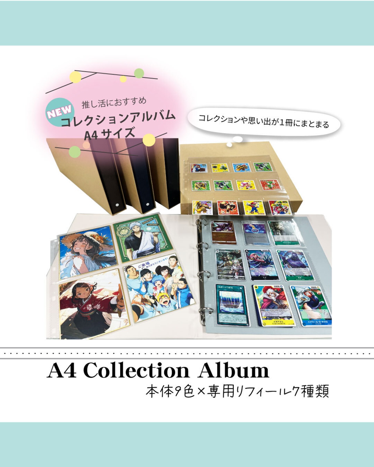 ●9色のコレクションアルバムA4サイズと、7種類の専用リフィール(別売)と組み合わせて、自分だけのコレクションアルバムを作ることができます