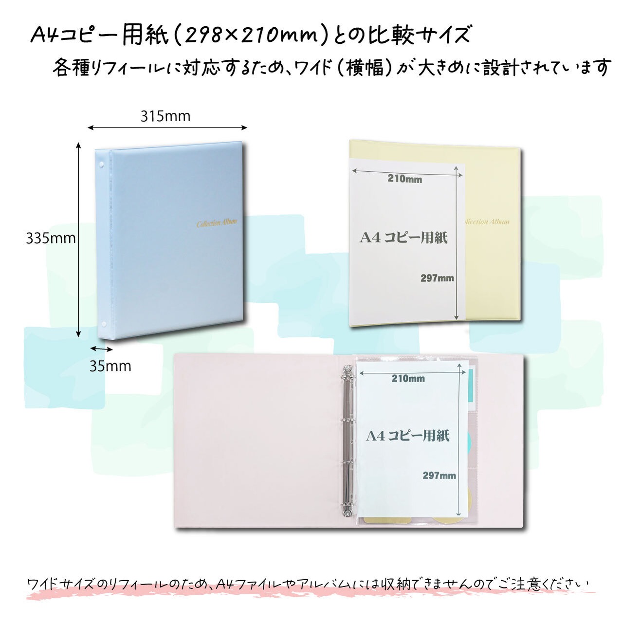 A4サイズのリフィールに6面のポケットがあり、チェキ(108×86mm)、L判写真(127×89mm)に対応しています