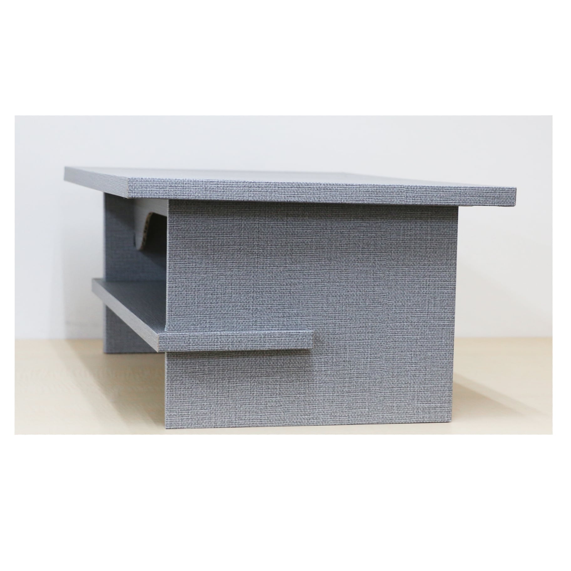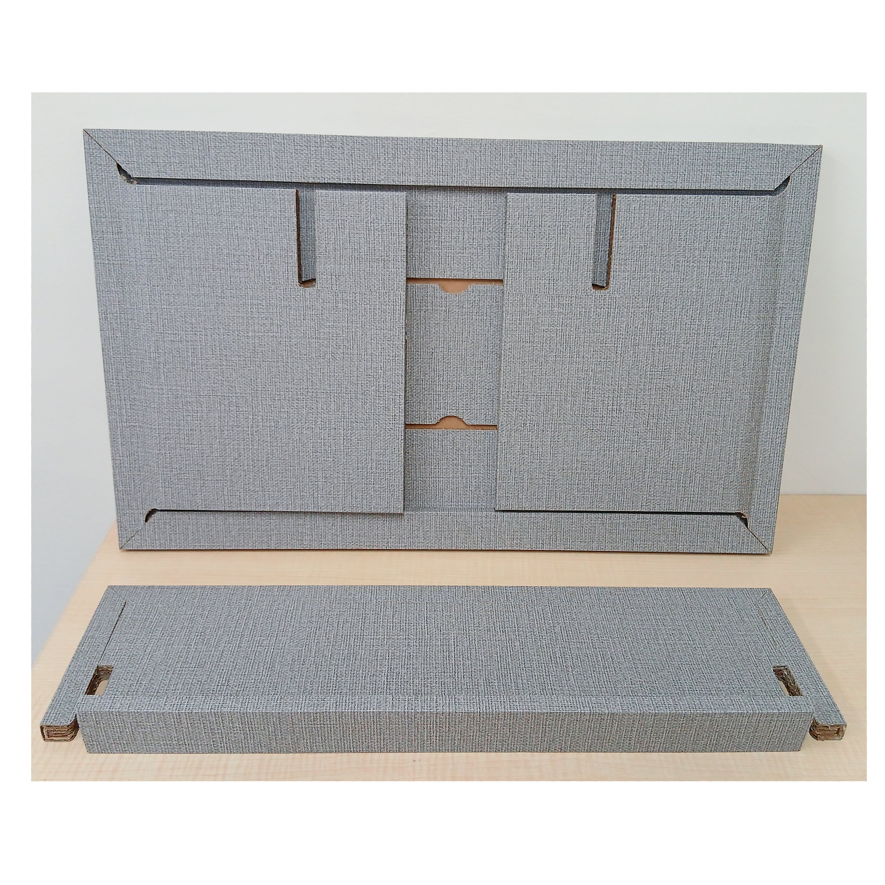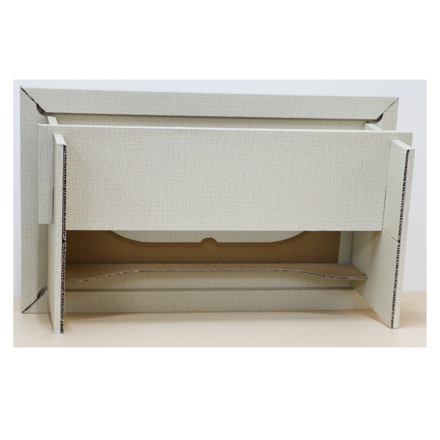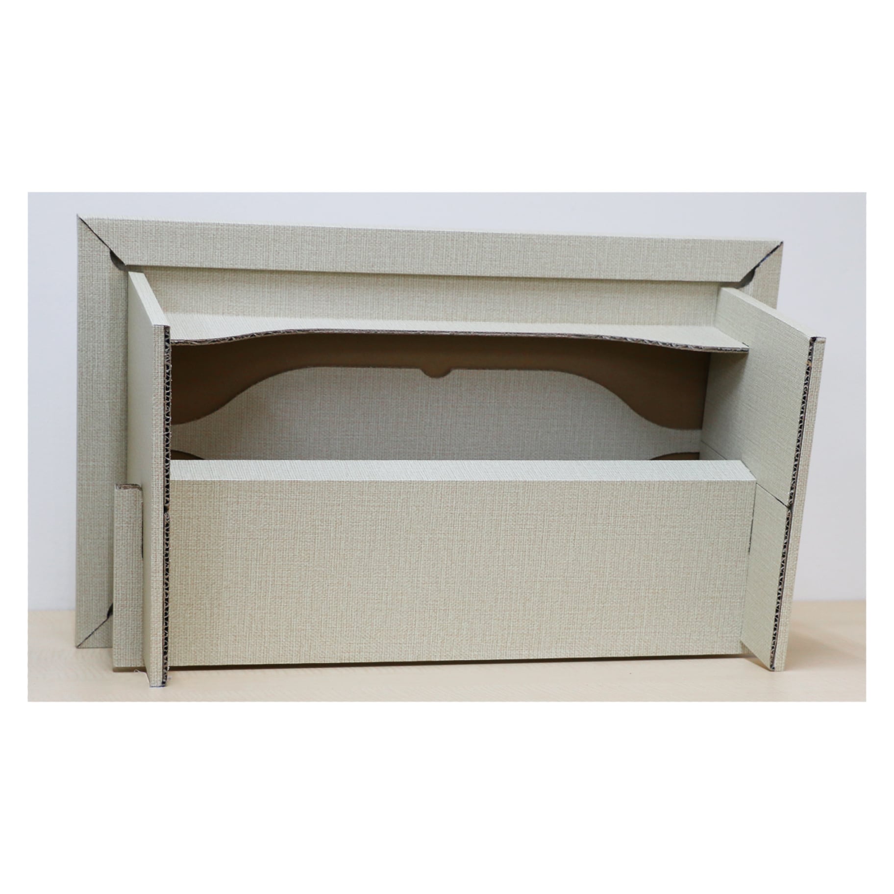また、ダンボールに高級感のあるクロス風のシートを貼っており、インテリアにもなじむ落ち着いたカラーリングになっています