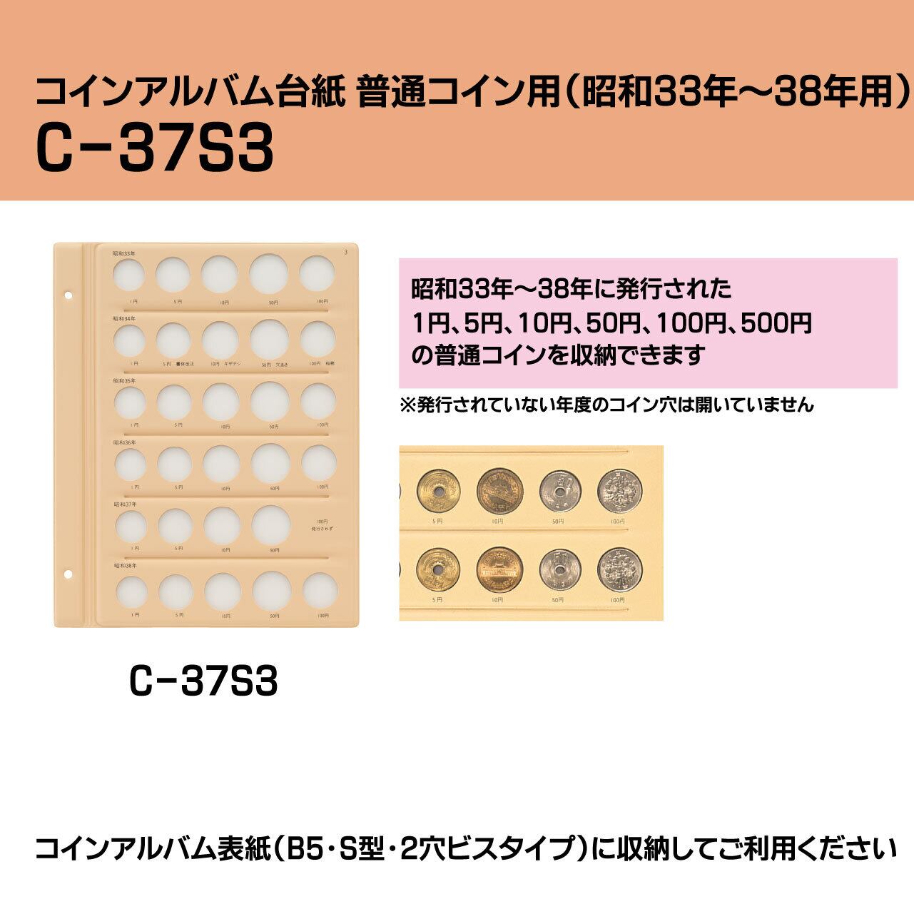 昭和33年~38年に発行された1円、5円、10円、50円、100円、500円を収納することができるコインアルバム台紙の【C-37S3】です。