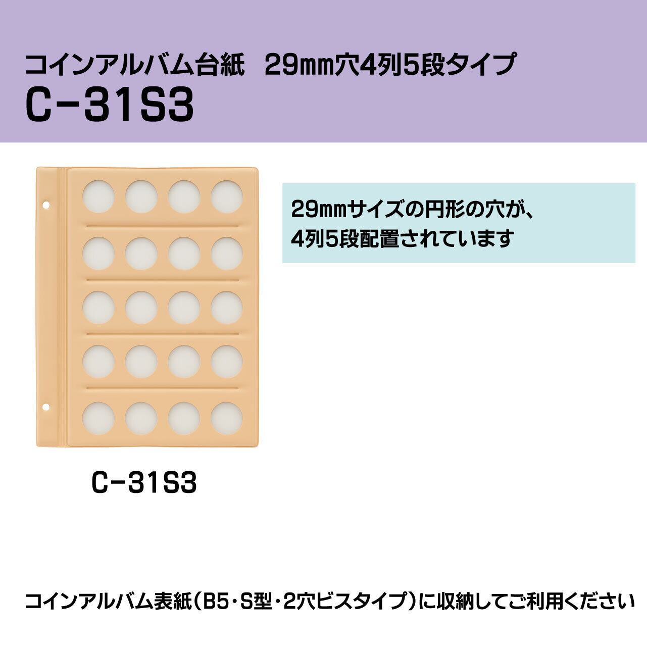 29mmの大きさの穴が4列5段で並んでいます。外国製コインなどを収納することができるコインアルバム台紙の【C-31S3】です。